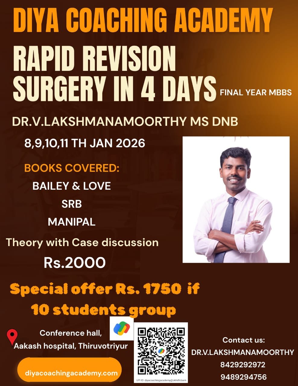 Join South India’s first-ever offline FMGE Rapid Revision Course, led by Dr. Lakshmanamoorthy and a team of experienced faculty, specially designed to give you a final-phase boost in your preparation journey.